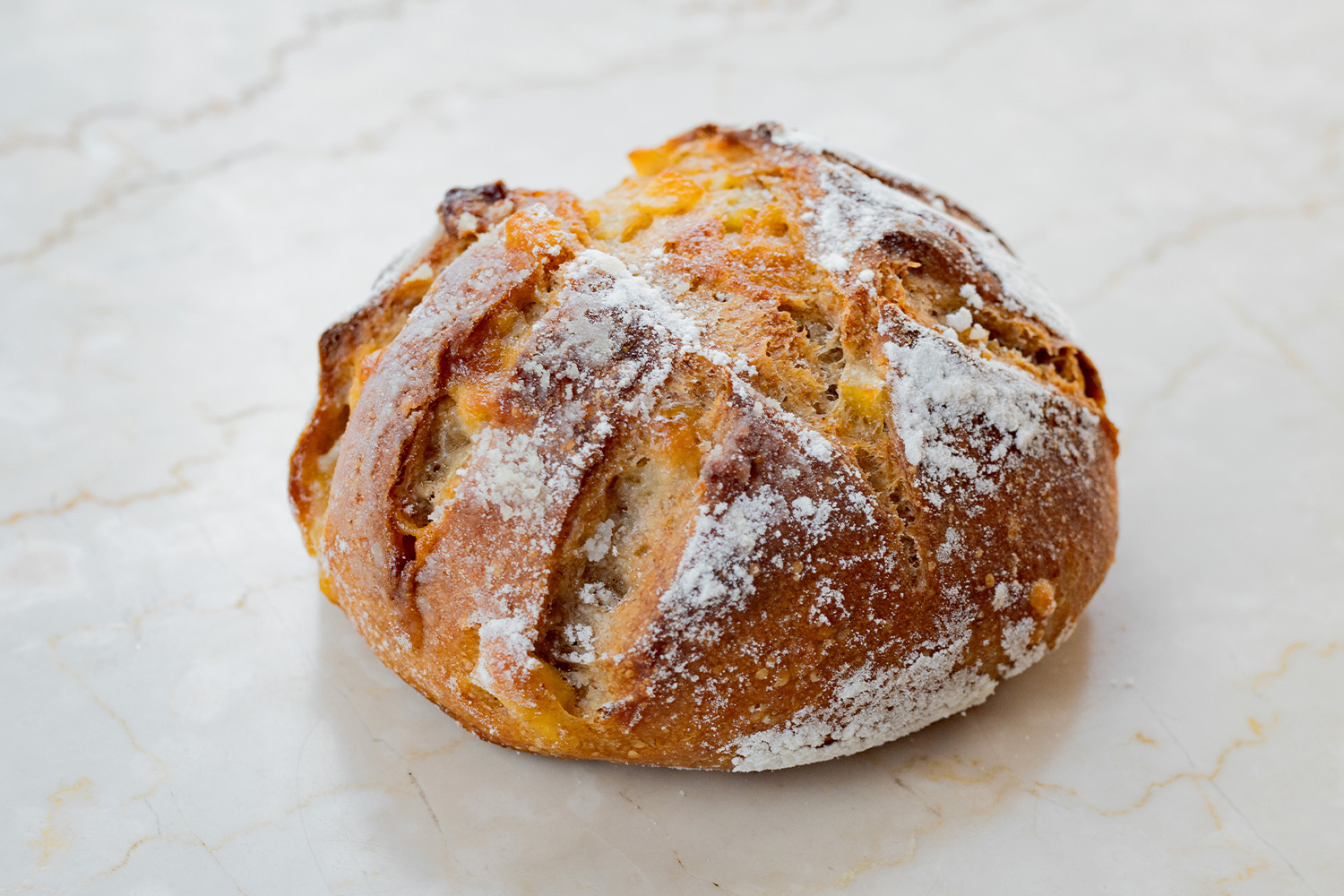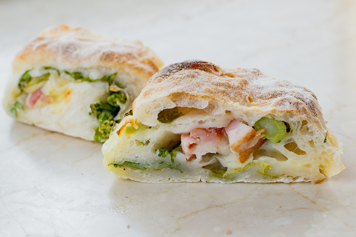 ルヴァン種使用で、柔らかい酸味と香ばしさ。高加水で中身はもちもちの食感に仕上げました。生地のやさしい酸味がハムやチーズとよく合います。